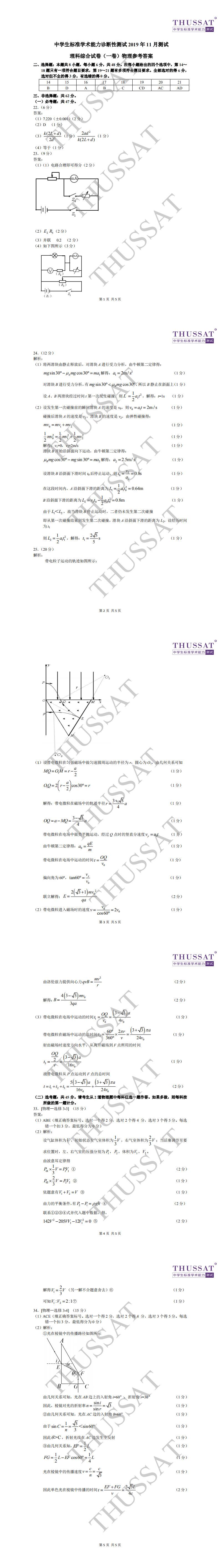 2019年11月中学生标准学术能力诊断性测试物理参考答案(一卷)