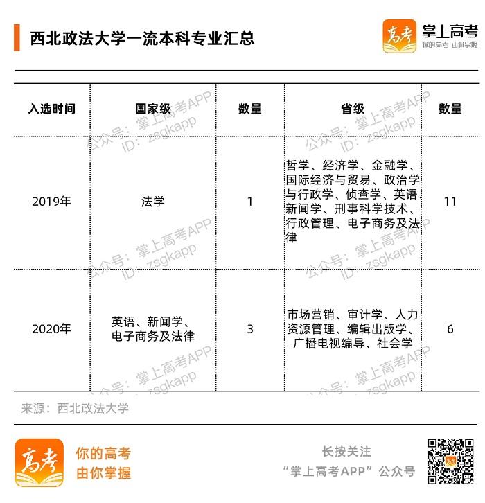 据“双万计划”名单显示,西北政法大学的法学、英语、新闻学、电子商务及法律等4个专业入选国家级一流本科专业建设点,哲学、经济学、金融学等17个专业获评省级一流专业建设点。除此之外,法学、哲学、侦查学还是国家级特色专业。