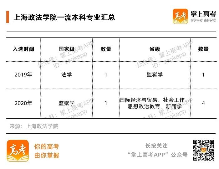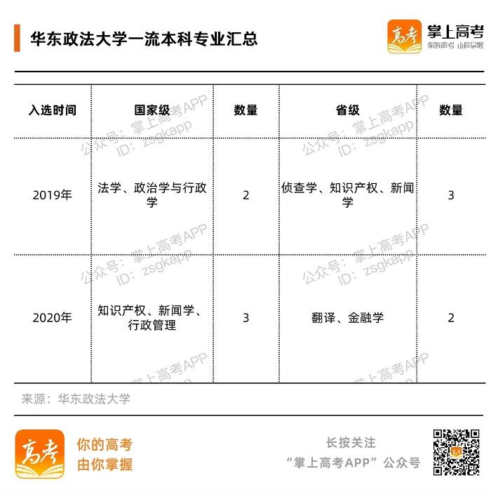 据“双万计划”名单显示,华东政法大学的法学、政治学与行政学、知识产权、新闻学、行政管理等5个专业均入选国家级一流专业,一流专业学科门类覆盖法学、文学、管理学等学科门类。