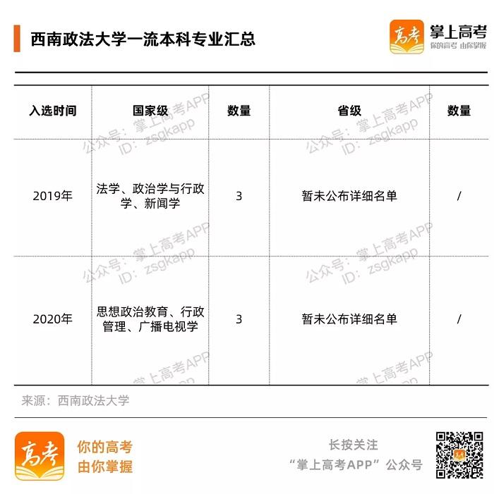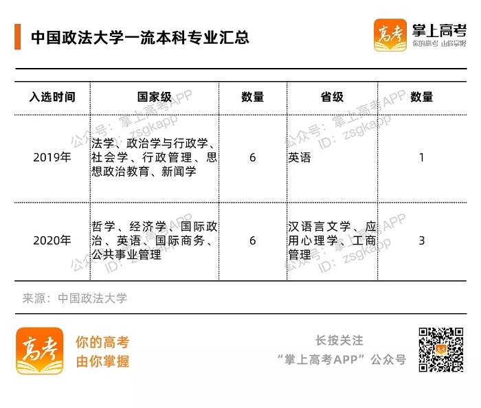 除此之外,据“双万计划”名单显示,中国政法大学的哲学、经济学、国际政治、英语、国际商务、新闻学等12个专业均入选国家级一流专业,一流专业学科门类覆盖法学、哲学、经济学、文学、管理学等学科门类。