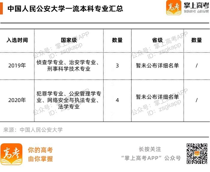 据“双万计划”名单显示,中国人民公安大学目前拥有侦查学专业、治安学专业、刑事科学技术专业、犯罪学专业、公安管理学专业、网络安全与执法专业、法学专业等7个国家级一流专业。建校至今,为全国政法公安机关等单位培养、输送了32万余名各级领导、业务骨干和专门人才,被誉为“共和国警官的摇篮”。