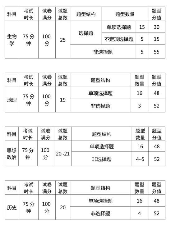 辽宁省2021年普通高中学业水平选择性考试科目包括物理、化学、生物学、思想政治、历史和地理等六科,考试形式均为闭卷、笔试。各科试卷结构如下:
