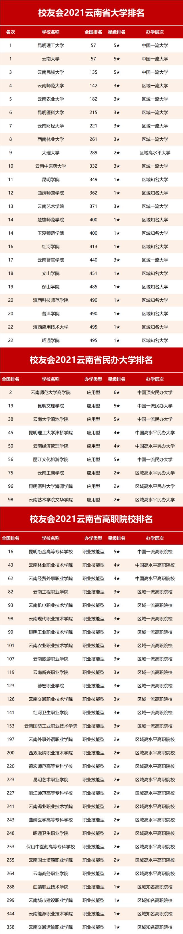 云南省哪所院校的综合实力排名最高?哪些大学跻身校友会2021云南省大学排名、云南省民办大学排名、云南省高职院校排名前3强?