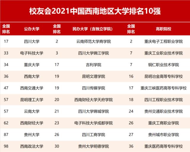 在最新2021中国西南地区大学排名中,昆明理工大学、云南大学、云南民族大学、云南师范大学、云南农业大学雄居校友会2021云南省大学排名前5强。云南师范大学商学院、昆明文理学院、云南大学滇池学院名列2021云南省民办大学排名前3强,昆明冶金高等专科学校、云南林业职业技术学院、云南经贸外事职业学院名列2021云南省高职院校排名前3甲。