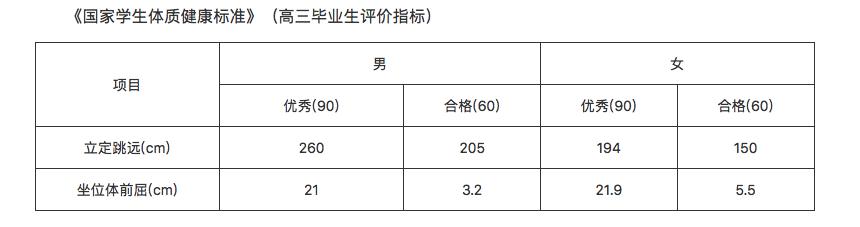 ✪ 体育测试:测试项目为身高体重指数(BMI指数)、坐位体前屈、立定跳远。执行《国家学生体质健康标准》(2014版)中对应项目高三年级组标准。
