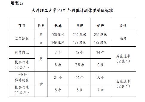 ✪ 体育测试:测试项目为立定跳远或50米跑(二选一)。考生需填写《体育测试项目确认表》(见附件1),选择参加的测试项目,考生本人签名,扫描上传至报名系统。考生需提前在当地保险公司购买测试期间个人“人身意外伤害保险”,测试当天查验保险单据原件,否则不能参加测试,成绩按不合格记录。测试按照《国家学生体质健康标准》(见附件2)中高三年级相应标准评定成绩,成绩达到60分及以上为合格、低于60分为不合格,不合格的考生不能获得我校强基计划拟录取资格。(附件1、2详见招生简章)
