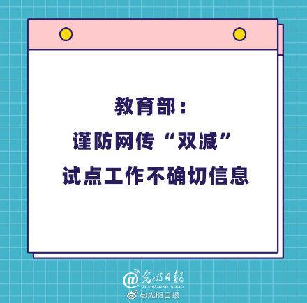 教育第一发布【教育部:谨防网传双减试点工作不确切信息】近日,网上流传关于开展减轻义务教育阶段学生作业负担和校外培训负担试点工作的信息,对此,教育部有关负责人表示,规范校外培训及减轻学生过重课外负担是常态工作,国家和地方出台政策以官方渠道发布内容为准,谨防误传形成不确切信息。 (光明日报全媒体记者晋浩天)