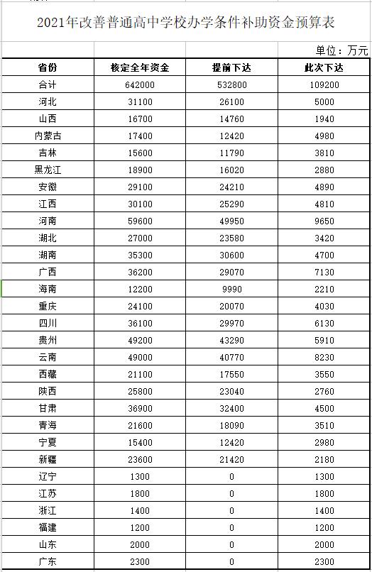 央视网消息:据财政部网站消息,近日财政部、教育部联合印发《关于下达2021年改善普通高中学校办学条件补助资金预算的通知》(以下简称《通知》),本次向各省(自治区、直辖市)下达改善普通高中学校办学条件补助资金预算合计10.92亿元,此前已提前下达53.28亿元。
