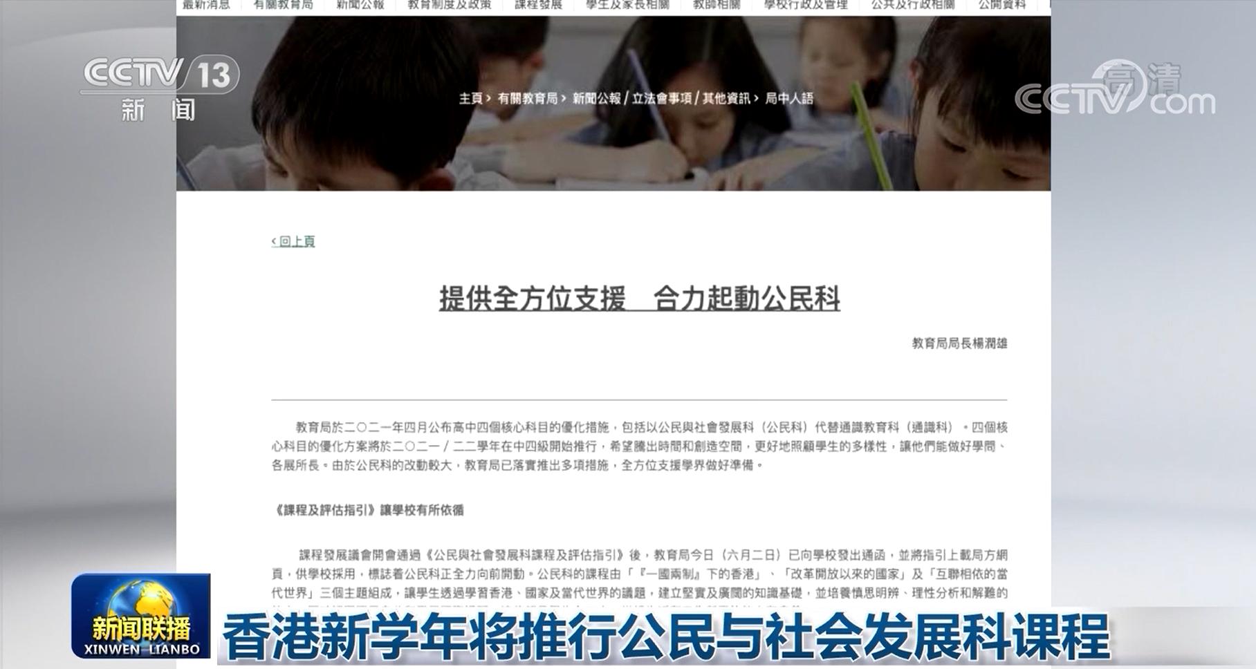 央视网消息(新闻联播):香港高中公民与社会发展科课程将于今年9月在香港高中一年级推行。香港特区政府教育局2日向学校发出通函,并正式公布《公民与社会发展科课程及评估指引》。指引要求相关课程由“‘一国两制’下的香港”、“改革开放以来的国家”和“互联相依的当代世界”3个主题组成,让学生建立坚实和广阔的知识基础,培养慎思明辨、理性分析和解难的能力,并认同国民身份和发展国际视野。特区政府教育局还将按照课程要求组织学生赴内地考察,了解国家发展成就,增强学生的国家意识与爱国精神。