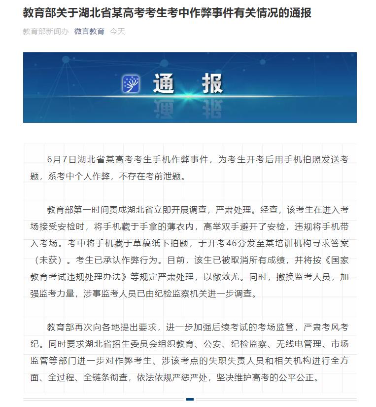 教育部第一时间责成湖北省立即开展调查,严肃处理。经查,该考生在进入考场接受安检时,将手机藏于手拿的薄衣内,高举双手避开了安检,违规将手机带入考场。考中将手机藏于草稿纸下拍题,于开考46分发至某培训机构寻求答 案(未获)。考生已承认作弊行为。目前,该生已被取消所有成绩,并将按《国家教育考试违规处理办法》等规定严肃处理,以儆效尤。同时,撤换监考人员,加强监考力量,涉事监考人员已由纪检监察机关进一步调查。
