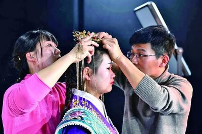 在山东曹县职业教育中等专业学校实训基地,胡春青(右)在为学生整理头饰,准备拍照。2018年,攻读博士学位的胡春青回到家乡山东曹县大集镇,一边研读学业一边创业,经营演出服装和汉服。近年来,山东曹县已有12000多名大学生返乡创业,成为当地乡村振兴路上的排头兵。新华社发
