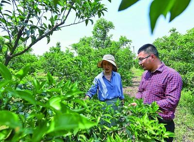 在四川彭山区公义镇,刘沈厅(右)到家庭农场主郑利彬的果园查看交流晚熟柑橘的长势情况。2016年底,从电子科技大学电子科学与技术专业硕士毕业后,刘沈厅放弃公派留学和留校的机会,回到家乡创办家庭农场,和父亲一起创业。新华社发