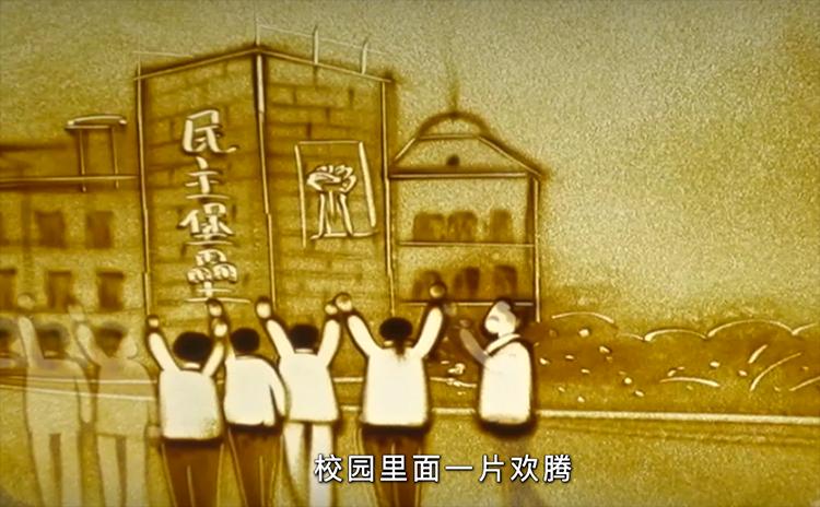 1948年5月4日,为纪念五四运动,上海各大中学校在交大举行营火晚会,最引人注目的是大草坪中央高高矗立的,由学生们用竹篱笆和彩纸搭建而成的“民主堡垒”。