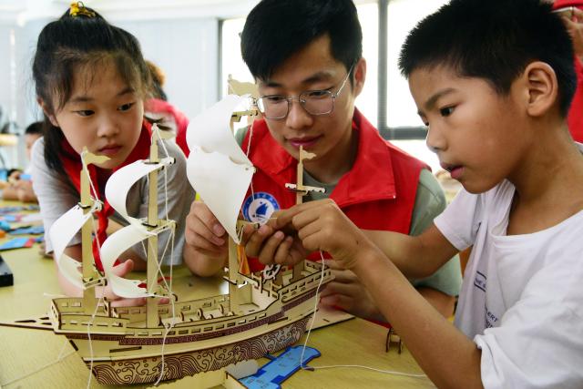 7月9日,在江苏省镇江市庄泉社区,大学生志愿者在指导小朋友拼装舰船模型。当日,江苏科技大学和江苏大学志愿者来到镇江市宝塔路街道庄泉社区,开展“学海防科普”活动,向小朋友介绍我国的航海史以及现代海防科普知识,指导小朋友拼装舰船模型,感受海防科技的魅力,迎接7月11日中国航海日的到来。 石玉成 摄