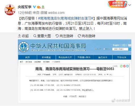 据中国海事局网站消息,广东海事局发布航行警告,3月21日至3月22日,每天9时至18时,南海,南澳岛东南海域进行实弹射击演习。禁止驶入!