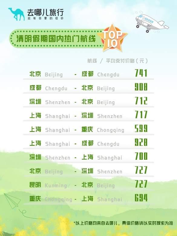 去哪儿数据显示,清明假期预订热度最高的国内航线是北京-成都,平均支付价格为741元。国内热门航线Top10中,三条航线由上海出发。上海也是今年清明假期,国内出游旅客量最多的城市。上海出发的游客主要去往深圳、重庆、成都、广州、北京、大连、沈阳、昆明、哈尔滨和三亚,上海出发机票的平均支付价格是636元。