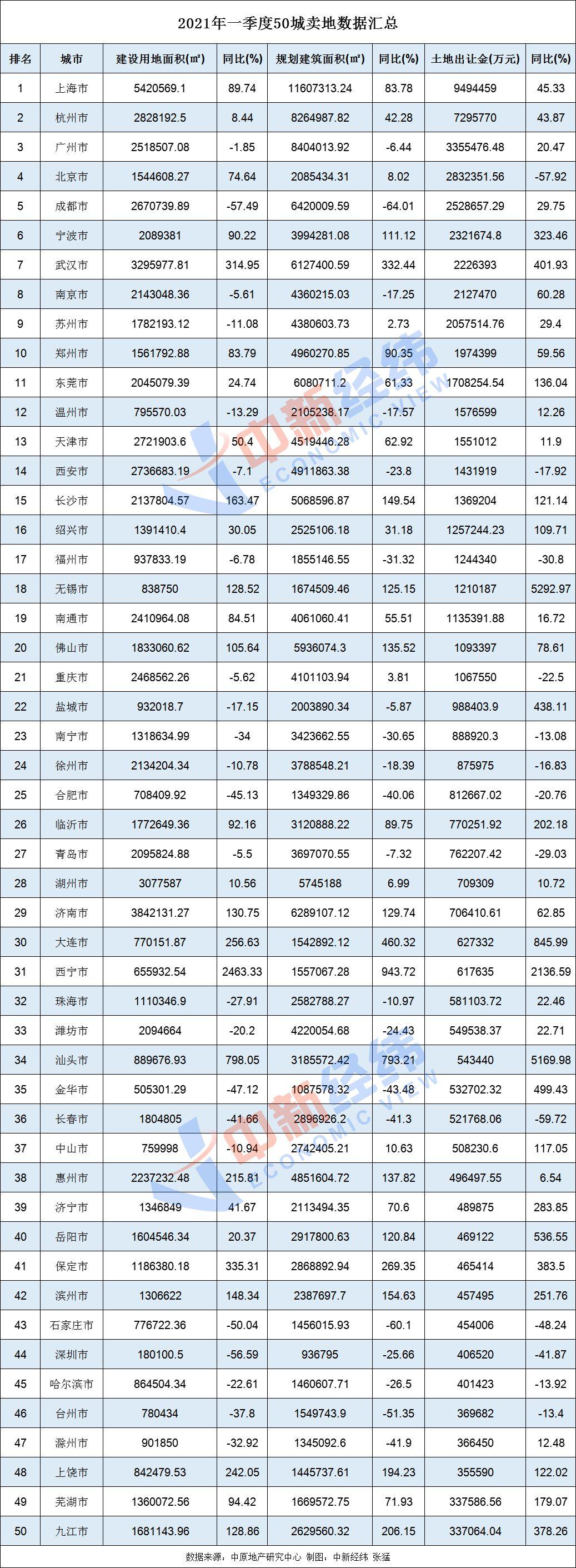 此外,数据显示,一季度,共有上海、杭州、广州、北京、成都、宁波、武汉、南京、苏州、郑州、东莞、温州、天津、西安、长沙、绍兴、福州、无锡、南通、佛山、重庆等21城卖地收入超百亿。