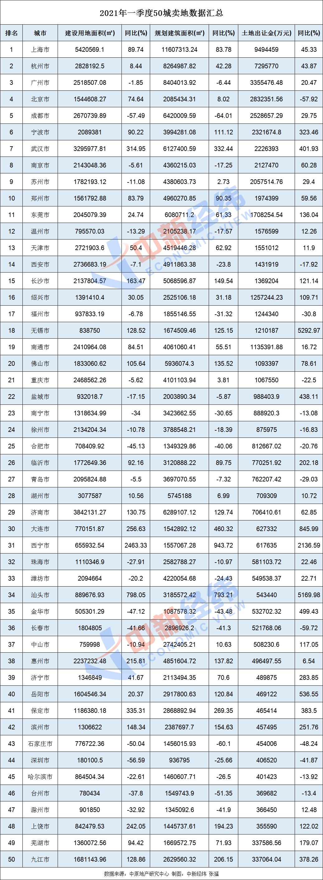 具体来看,50城中,一季度,上海卖地超900亿,收入最多;杭州紧随其后,卖地超700亿;广州卖地超300亿,居第三名。在卖地收入增速方面,无锡增速最快,同比增长5292.97%。