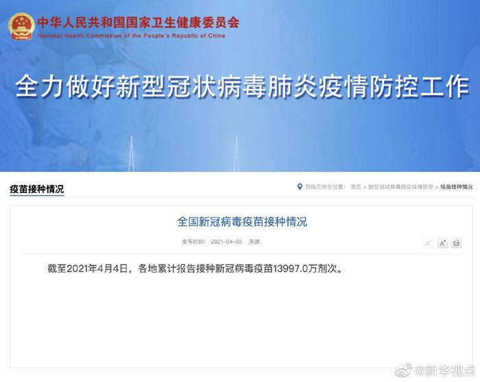 国家卫健委5日发布,截至2021年4月4日,各地累计报告接种新冠病毒疫苗13997.0万剂次。