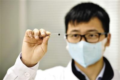 在合肥恒烁半导体有限公司,工作人员展示已封装的50纳米128M高速低功耗NOR Flash存储芯片。该芯片可应用于人工智能、汽车电子、手机等行业,目前已实现量产。