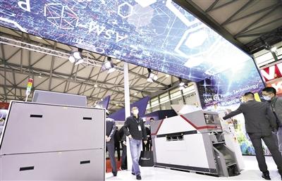 3月17日,2021中国国际半导体展在上海新国际博览中心开幕,1100多家国内外行业展商在展会上集中展示芯片设计、制造、封测以及设备、材料供应等全产业链领域内的产品和技术。图为参观者走过一组晶圆处理设备展品。新华社记者 方喆 摄