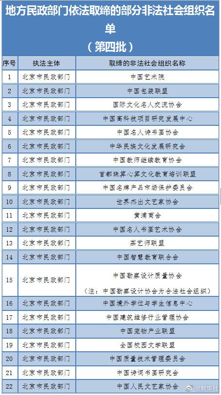民政部7日公布第四批地方民政部门近年来依法取缔的部分非法社会组织名单,包括中国艺术院、中国境外学位与学生信息中心等64家。民政部提示社会公众,如果发现名单中的非法社会组织仍在开展活动的,请依法向公安机关报案。同时,民政部还提示,在与社会组织开展合作或参与其活动时,可通过“中国社会组织政务服务平台”(www.chinanpo.gov.cn)、“中国社会组织动态”政务微信(微信号:chinanpogov)核实其身份,避免上当受骗。(记者高蕾)