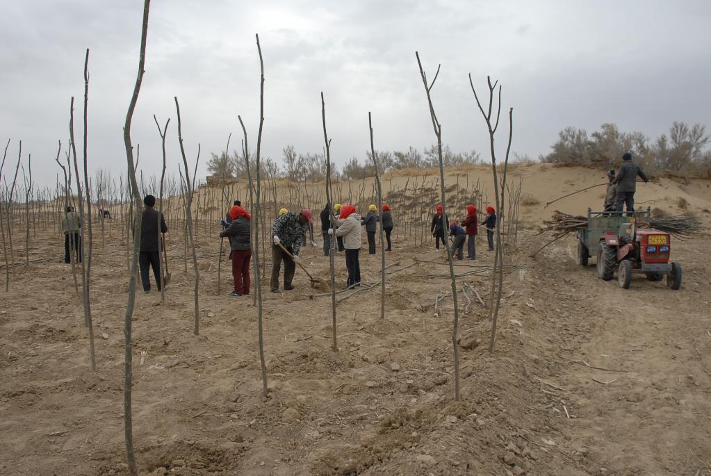 内蒙古自治区巴彦淖尔市磴口县群众在乌兰布和沙漠植树造林(新华社记者李云平 摄)