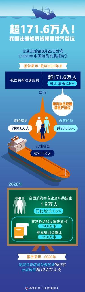 新华社北京6月25日电(记者周圆)记者25日从交通运输部获悉,截至去年底,我国共有注册船员超171.6万人,同比增长3.5%,船员队伍规模居世界首位。其中海船船员、内河船员分别约为80.8万人、90.8万人,女性船员超25.8万人。