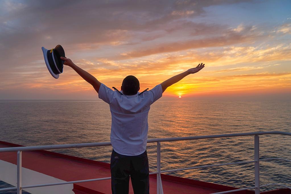 福建海运集团远洋散货船“金海发”轮大副陈江在航行途中观赏海上夕阳。新华社记者 才扬 摄
