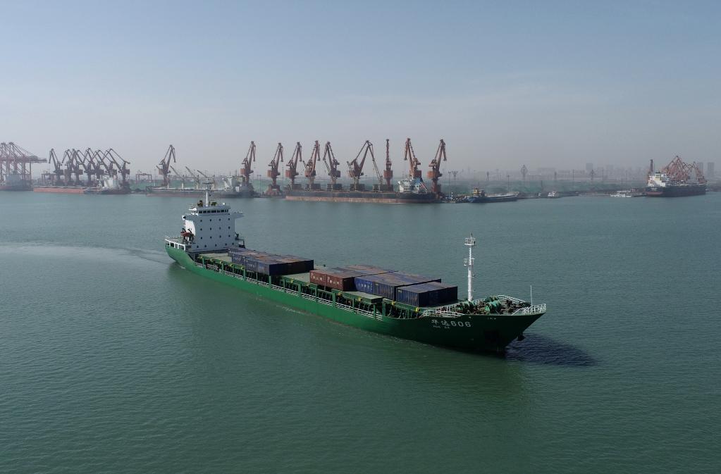集装箱轮船驶离唐山港京唐港区集装箱码头。新华社记者 杨世尧 摄