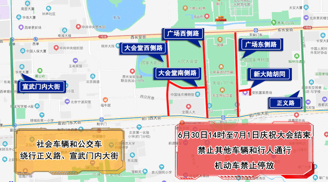 6月30日14时至7月1日庆祝大会结束,人民大会堂西侧路、人民大会堂南侧路、天安门广场东侧路、天安门广场西侧路、新大陆胡同,除持有庆祝大会专用证件的车辆和人员外,禁止其他车辆和行人通行,机动车禁止停放。社会车辆和公交车经正义路、宣武门内大街绕行。