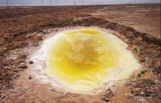 近日,青海省茫崖市官方在该市花土沟镇小鸭湖境内发现了两个黄色的小泉,白色的盐碱壳环绕啤酒黄水如同刚刚煮好的荷包蛋。
