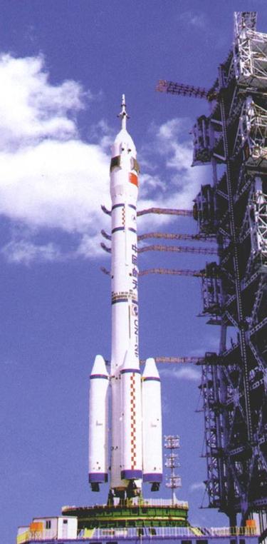 △矗立在发射架上的长征二号捆绑式新型运载火箭