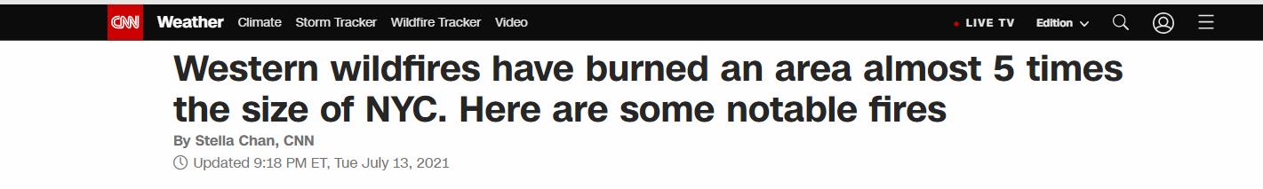 △ 美国有线电视新闻网7月13日报道《(截至7月13日)美国西部山火过火面积相当于约5个纽约市》