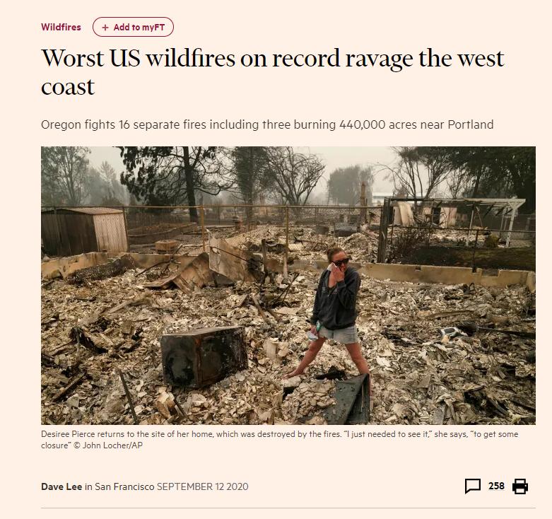 △ 2020年美国西部大火,《金融时报》报道《迄今为止最严重的山火席卷美国西海岸》