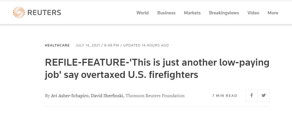 △ 路透社报道《负担繁重的美国消防员称“这不过是另一份低收入工作”》