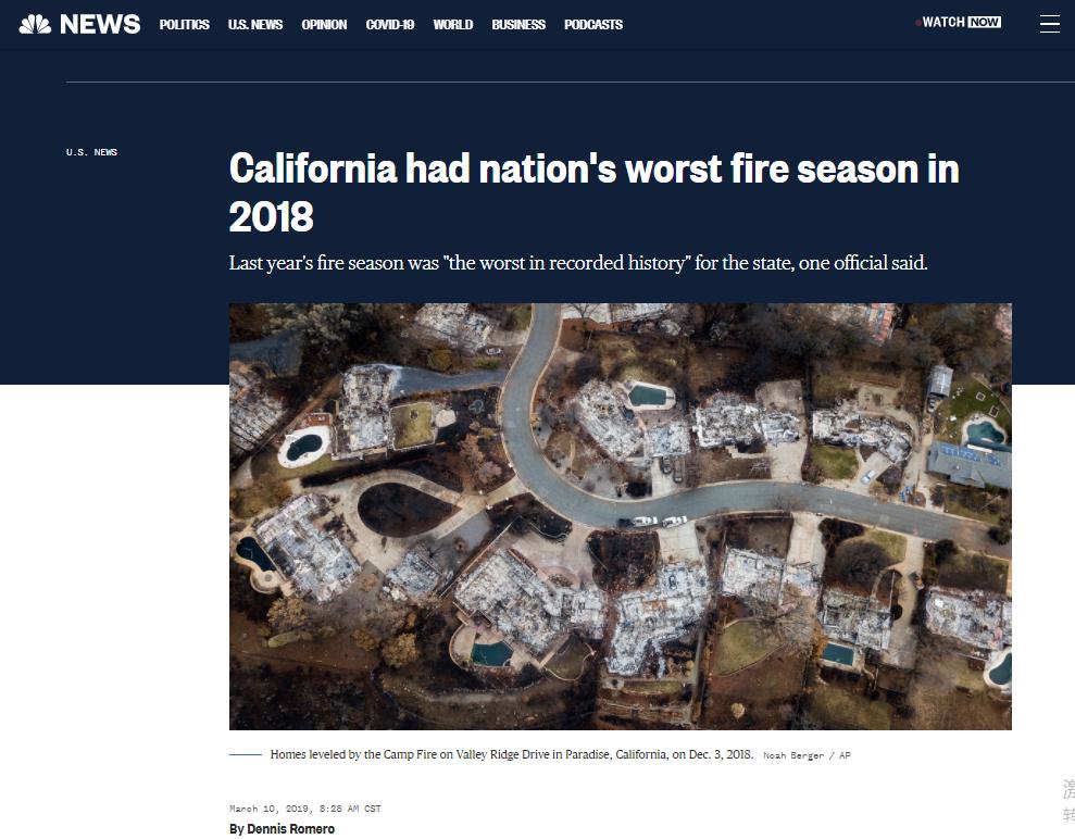 △ 美国全国广播公司报道《加利福尼亚州在2018年经历了全国历史以来最严重的山火季》