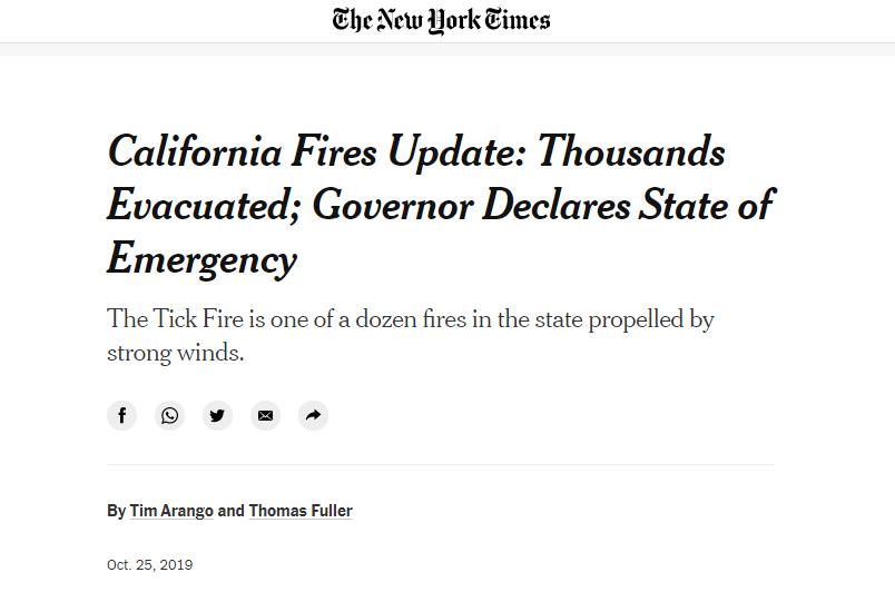 △ 《纽约时报》2019年报道《加州火灾数据:数千人撤离 州长宣布进入紧急状态》