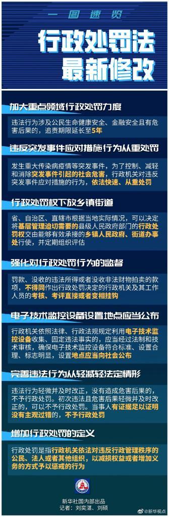 全国人大常委会法工委有关负责人日前在接受“新华视点”记者采访时表示,新修订的行政处罚法增加综合行政执法制度、健全行政处罚规则、完善行政处罚程序,为深入推进依法行政、推动法治政府建设提供了法律保障。