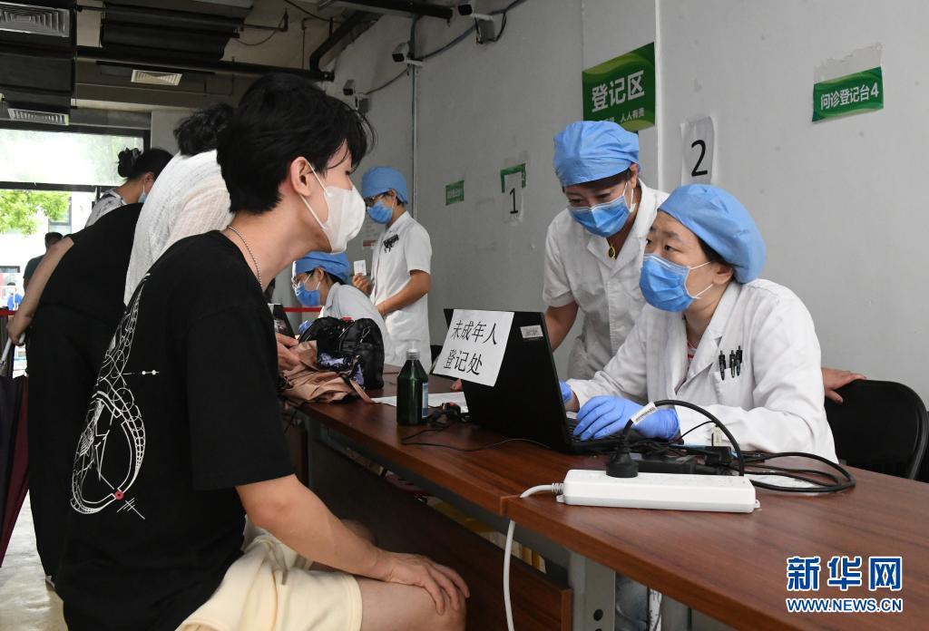 7月21日,在北京市西城区展览路街道新冠疫苗接种点未成年人登记处,医护人员询问一名高中生的信息。新华社记者 任超 摄