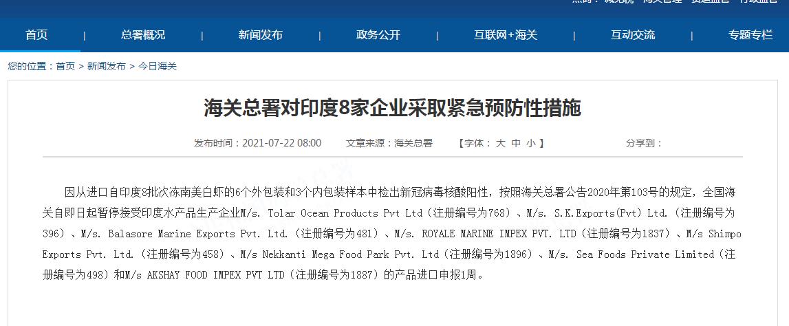 因从进口自印度8批次冻南美白虾的6个外包装和3个内包装样本中检出新冠病毒核酸阳性,按照海关总署公告2020年第103号的规定,全国海关自即日起暂停接受印度水产品生产企业M/s. Tolar Ocean Products Pvt Ltd(注册编号为768)、M/s. S.K.Exports(Pvt) Ltd.(注册编号为396)、M/s. Balasore Marine Exports Pvt. Ltd.(注册编号为481)、M/s. ROYALE MARINE IMPEX PVT. LTD(注册编号为1837)、M/s Shimpo Exports Pvt. Ltd.(注册编号为458)、M/s Nekkanti Mega Food Park Pvt. Ltd(注册编号为1896)、M/s. Sea Foods Private Limited(注册编号为498)和M/s AKSHAY FOOD IMPEX PVT LTD(注册编号为1887)的产品进口申报1周。