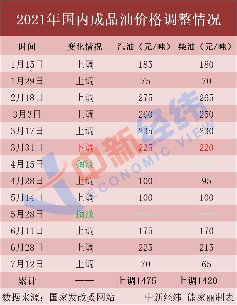 据中新经纬客户端统计,2021年以来,国内成品油调价已进行了十三轮,汽油总计上调了1475元/吨,柴油总计上调了1420元/吨。如果此次价格下调落实,2021年成品油调价将呈现“十涨两跌两搁浅”的格局。