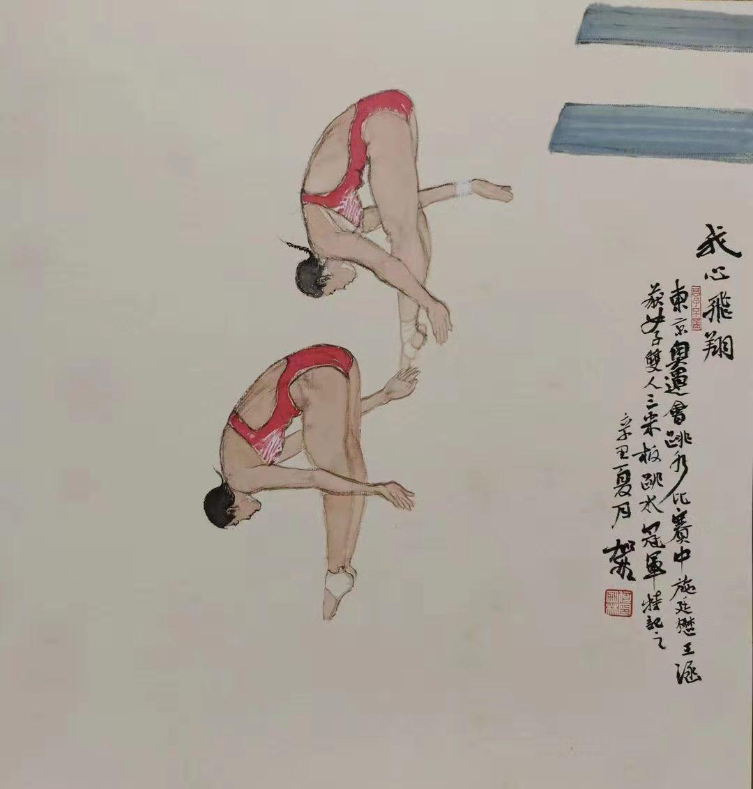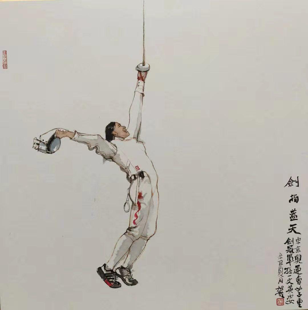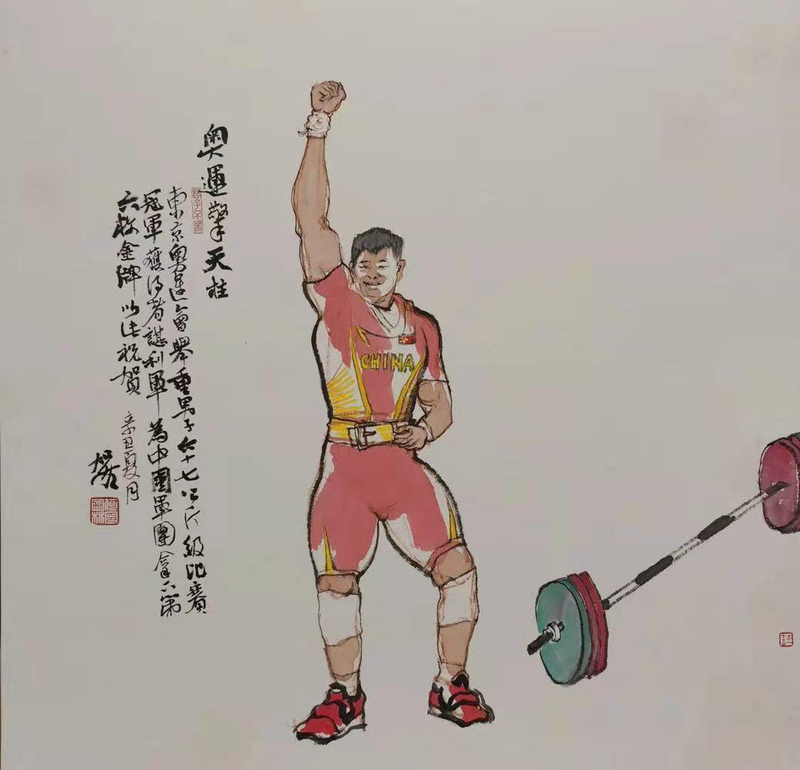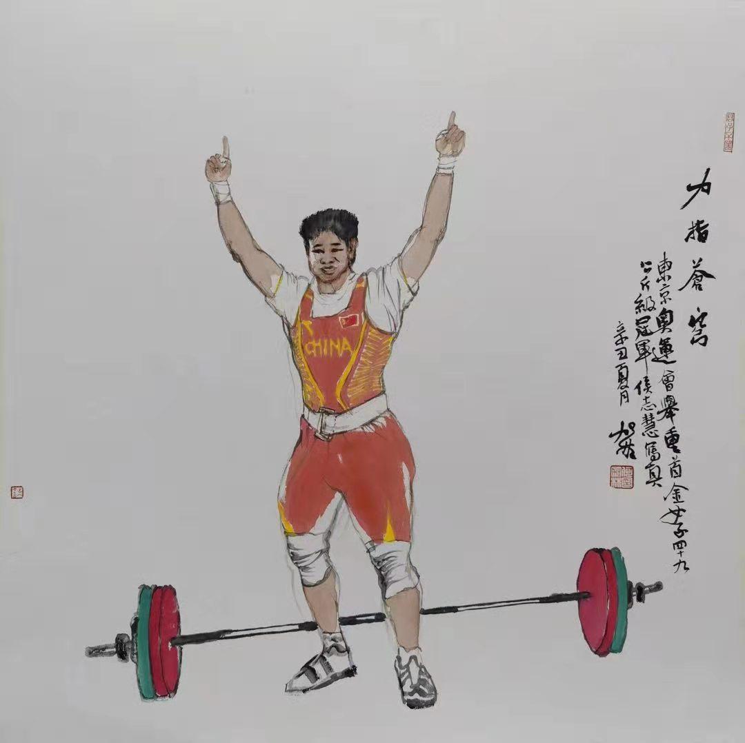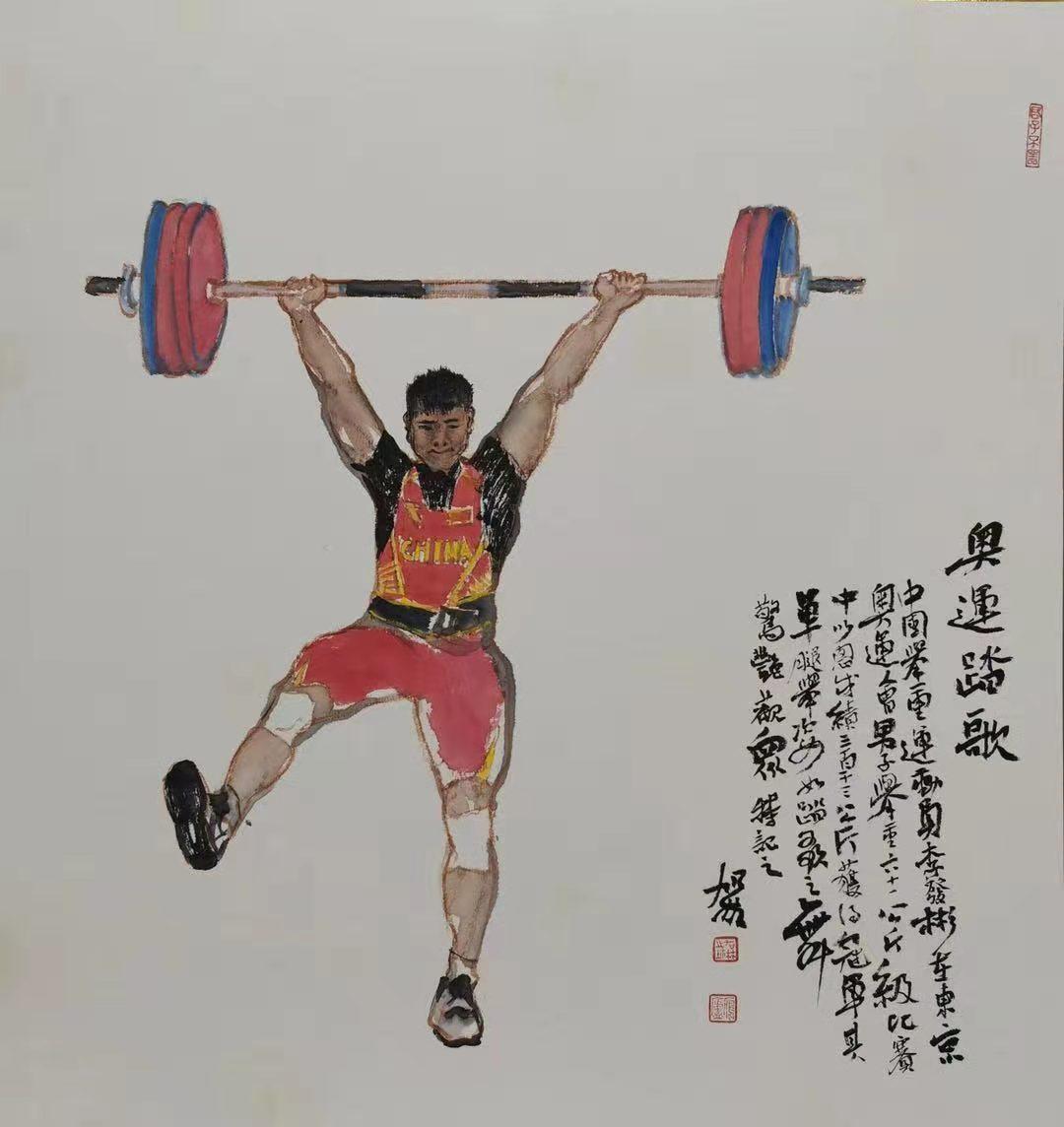 在何加林的画笔下,女子和男子举重、击剑、女子双人跳水等我夺金运动员的英姿尽情展现。
