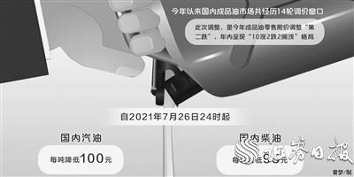 7月26日,国家发改委发布消息,根据近期国际市场油价变化情况,按照现行成品油价格形成机制,自2021年7月26日24时起,国内汽油、柴油价格(标准品,下同)每吨分别降低100元和95元。