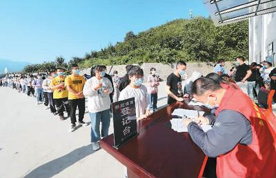 图为8月1日,在贵州省毕节市金海湖新区青龙街道,15至17岁人员在排队登记信息,准备接种新冠疫苗。