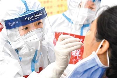 图为8月1日,在河南省郑州市二七区的一个核酸检测点,工作人员对市民进行核酸检测取样。