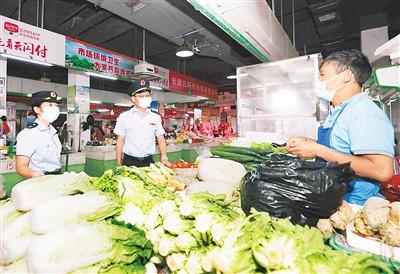 图为8月1日,在湖南省张家界市武陵源区一家农贸市场,市场监督管理部门工作人员在了解市场供应情况。