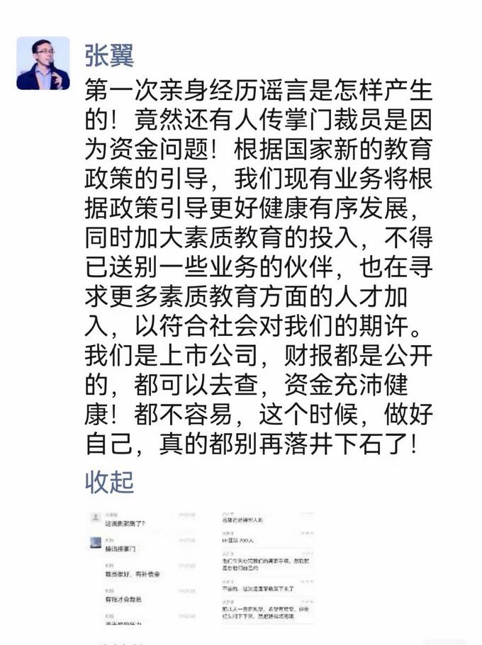 怒发朋友圈的还有掌门教育创始人张翼,面对倒闭的传闻,张翼亦劝告造谣之人“别落井下石”。