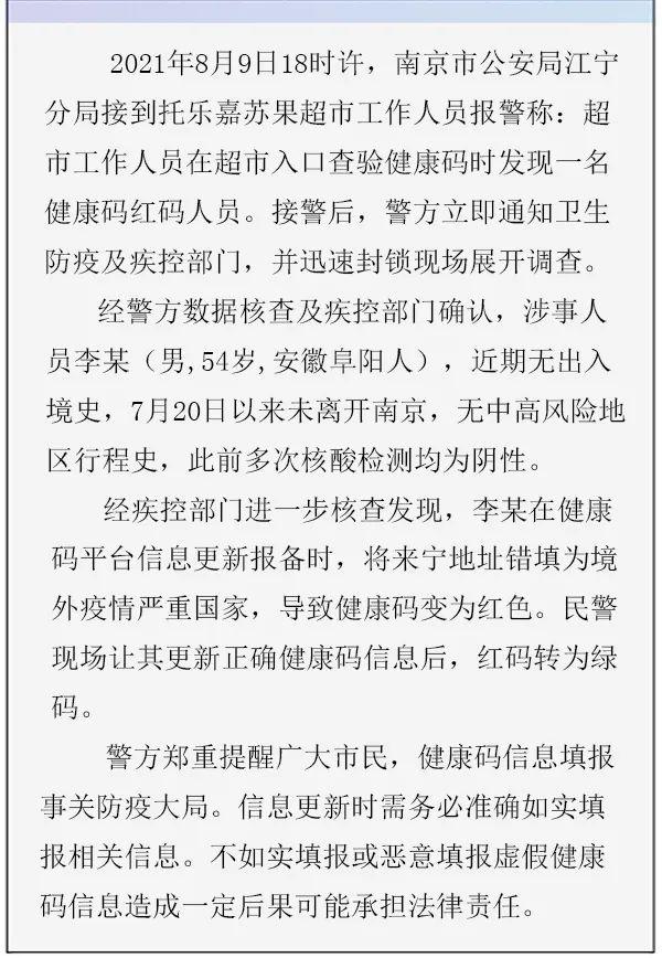 根据江宁公安分局的通报,实际情况是托乐嘉苏果超市工作人员在超市入口查验健康码时发现一名健康码红码人员,遂报警。