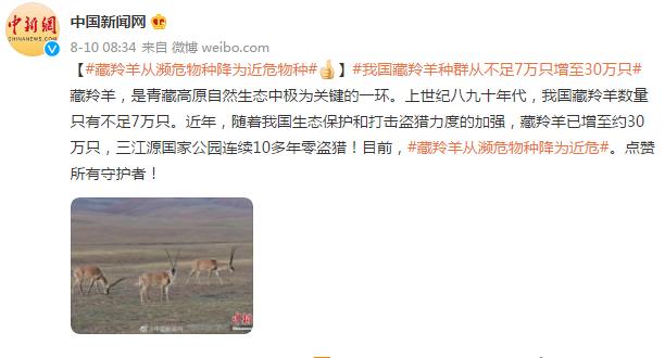【#藏羚羊从濒危物种降为近危物种#】我国藏羚羊种群从不足7万只增至30万只。藏羚羊,是青藏高原自然生态中极为关键的一环。上世纪八九十年代,我国藏羚羊数量只有不足7万只。近年,随着我国生态保护和打击盗猎力度的加强,藏羚羊已增至约30万只,三江源国家公园连续10多年零盗猎!目前,藏羚羊从濒危物种降为近危。点赞所有守护者!